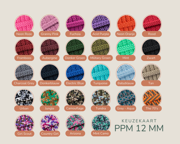 PPM-touw is een stevig en waterafstotend product dat veilig is voor je hond. We zetten het touw van je tug zorgvuldig in elkaar, zodat het risico dat je tug tijdens het spelen kapot gaat, heel klein is. Onze Boeventugs worden met 8mm of 12mm dik PPM-touw gemaakt. Aan jouw de keuze voor welk touw je gaat. Kijk daarbij naar het gewicht van je hond en hoe fanatiek je hond is met trekspelletjes. Wij kunnen uit ervaring delen: bij fanatieke trekkers en honden vanaf zo'n 20 kg ligt 12 mm PPM touw fijner in de hand. Om de kleur te bepalen hebben we beide kleuroverzichten toegevoegd. Van beide touwen hebben we standaard dezelfde 20 kleuren op voorraad.